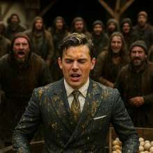 He emerges, gasping, his suit a sodden ruin, his gold tie clip glinting feebly through the muck. The crowd roars, a minstrel strums a mocking tune, and a wench shouts, "Behold the Muddy Merchant!"