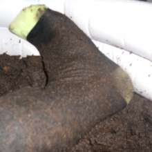 I lifted one foot over the side of the container and lowered it into the mud. I winced as my shoe went in. I could instantly feel the mud oozing all over the exposed bit of my thin, black sock. I was nearly up to my knee by the time my ballet pump touched the bottom of the bog. The audience was going crazy at the sight of me with one foot in the mud. I stepped straight in with the second foot and lowered it right down next to the other one so I was properly knee-deep in it, with both legs. I couldn't believe how slimy and smooth it felt as it soaked into both socks. The ballet pumps had done very little to protect my socks! I imagined the mud seeping into my shoes and making the yellow heels and toes of my socks all dirty. It was funny to think of my nice socks, buried in this mud. I thought I should start looking for the money in the middle of the bog, and work outwards, so I steeled myself to wade across the knee-deep ooze. I pulled upwards with my left leg with the intention of taking a large step through the mud. I knew instantly that my shoe had come off. The mud was so thick that my foot had just come straight out of it. I just about managed to get my foot out of the mud. I stood awkwardly on one leg, displaying my bedraggled, muddy black sock. Amazingly, quite a lot of the bright yellow toe area was still clean and it looked ridiculously colourful against the backdrop of wet, brown earth that I was surrounded by. "I've lost my shoe!" I squeaked. The host, and the audience laughed like maniacs at the sight of me. Things rapidly got much worse. I started to lose my balance, so hurriedly put my sock down into the mud to stabilise myself. I stumbled slightly and as I lurched forward, I lost my right shoe too, and landed on my knees in the heaving, filthy mass. The mud was like glue at the bottom of the pit and had instantly nicked my ballerinas! "My other shoe has come off!" I screamed. It felt so weird to feel the slimy mud through my thin socks. I wiggled my toes, almost enjoying the feeling of freedom now my shoes were off. I guessed that the bright yellow heels and toes would never be the same again after this! I didn't see any point digging my shoes out at that time, I might as well do this in my socks now, I thought. There didn't seem any point trying to protect the (actually really nice) socks that I had on. They were completely covered in mud and beyond concern! Besides, if I did manage to put my shoes back on, it wouldn't be for long in mud this thick and deep.