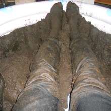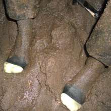 She waded awkwardly towards me with her bucket of sloppy mud, getting her shoes completely covered in mud in the process, as well as the legs of her thin boiler suit. I could see that mud had squelched all over the large exposed parts of her black socks, through the large cut-outs in the shoes. Each step was accompanied by a loud sucking squelch as she pulled her foot out. I wondered if she would lose one, or even both shoes like I had, but it seemed that the straps were keeping them on despite the thick, sucking mud.