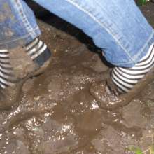 With the continuing rendition of "Mud, Mud, Glorious Mud" in the background, I couldn't quite believe what I was doing as I climbed over the side of the tank and nervously lowered my shoeless feet towards the mud. I paused just before making contact with the wet ooze to admire my jazzy socks for the last time. Then, turquoise tips first, I eased them down into the heavy, wet mud, with a sigh. It was quite thick but yielded easily under my weight and I quickly sank well over my ankles in it by the time I was standing on the bottom of the tank. It was shocking watching my brightly coloured socks disappear into the heaving quagmire! It felt so cool and heavy as it stuck all over my jeans and socks, imagine sinking into deep cow poo with no shoes on! I reckon it was nearly a foot deep too. It was so cold! I just stood there, very nearly up to my knees in mud, not sure what to do next. I felt quite awkward and embarrassed, but also strangely proud that I'd done something so gross! It actually felt lovely and free not having shoes on, I wiggled my toes, enjoying the smooth, squelchy feel of the mud through my socks. It felt a bit like paddling in the sea, except I was wearing socks and it was thicker and much filthier! The other girl was laying down on her back in it by now, caked in the stuff, looking up at me and laughing.