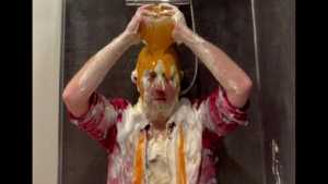 Surprised piedinmyshorts with a big sloppy cream pie to the face