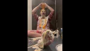 Smeared a handful of rainbow icing on MessyWeeb's butt