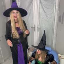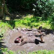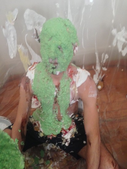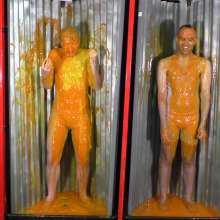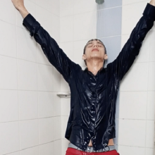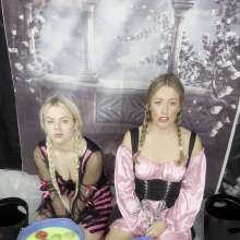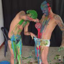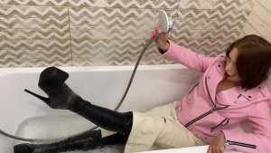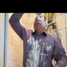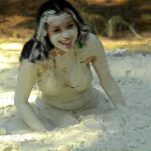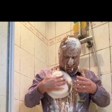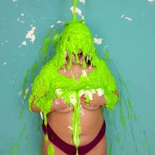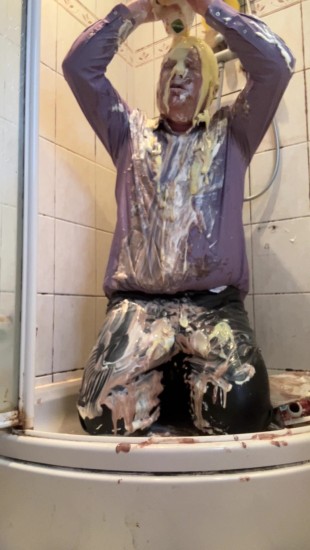 Lights come back to normal and there's a sudden rush of shave foam! Before long both ladies are completely coated in slime and foam, making a frothy mess that can barely be identified as people. In a moment of ecological responsibility, Larz scoops up a bucket full of slime and foam to "recycle" and pours it over Blu's head. With fun time drawing to a close, they turn on the water and start filing the tub so that they can rinse off.