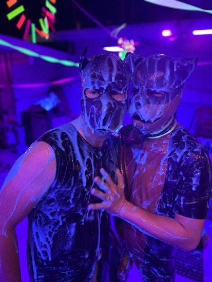 Guys and girls lube up with slimy nuru gel (methylcellulose / Natrasol type lotion) and massage them with their naked bodies. Then very happy endings...