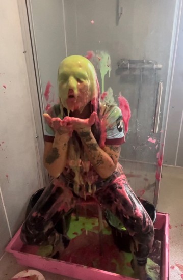 Brook Logan is bound and gagged, and then deluged in gallons of porridge and other mess! She starts out furious but strips naked for some naughty fun...