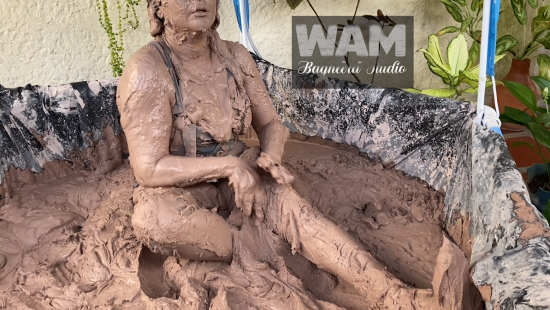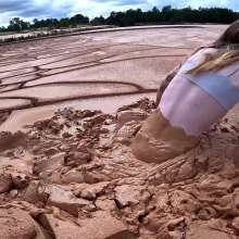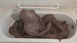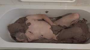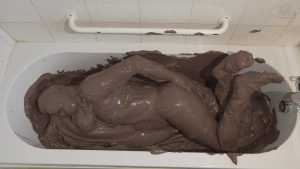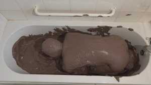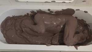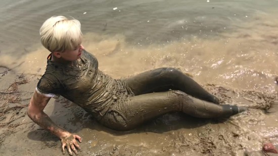 How fun it is to have to go into the pit to stir all the clay and hydrate it. I couldn't miss this opportunity to record the moment so you can join me in the fun. Wearing denim overalls, a sheer blouse, and my cowboy boots, I was ready to dive into all that mud, which over the days had become really thick and sticky. After covering myself completely in all the mud, I took off my boots to continue the fun barefoot. I also collected a huge amount of mud (a huge mountain) and dove in headfirst, literally up to my shoulders. It was so incredible! You are my special guests, so don't miss this fun and muddy adventure!