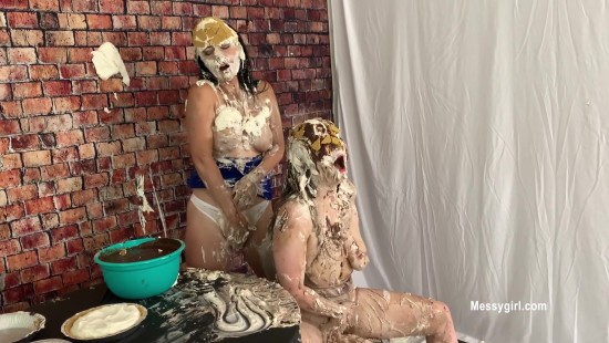 Larz brought her buddy Blu over to experience a sliming in the MessyHot fashion. The ladies explain that usually it's Larz getting Blu messy and that they've never really had a chance to have a mutual mess. Larz also points out that this is her first time getting messy since installing the upgrades. A quick nose goes decides that Blu will be the first to be made a mess of. Larz starts by splashing her with some blue slime which is still nice and warm. Getting to work, the slime is rubbed into Blu's pits and then drizzled all over her feet. Always one to take charge, Larz bends Blu over and delivers some slime over her presented booty. She pulls back the panties and gives her friend a slime wedgie as a treat. Now it's Blu's turn to administer the mess. She takes a bucket of pink gunge and pours it "right on your big old noggin." Straight to the dome. The ladies continue to flop and writhe about in the gunge while we switch to UV blacklight mode and the entire room comes to life. The glowing neon colors are super eye catching during their roll in the tub together. Larz pours a third bucket of neon blue thick slime over blu's face completely covering her glasses. To wrap up the black light portion there are some fantastic slime wedgies. Lights come back to normal and there's a sudden rush of shave foam! Before long both ladies are completely coated in slime and foam, making a frothy mess that can barely be identified as people. In a moment of ecological responsibility, Larz scoops up a bucket full of slime and foam to "recycle" and pours it over Blu's head. With fun time drawing to a close, they turn on the water and start filing the tub so that they can rinse off.