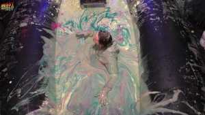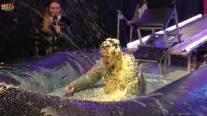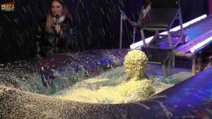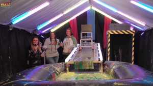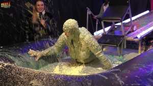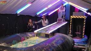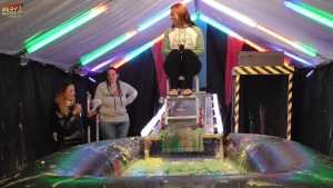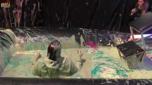 Well-dressed ladies wear expensive silk and satin outfits and uniforms into very wet and messy situations.