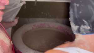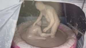 Pixie Bell decided it was time that Ellie lose her clothing and succumb to the mess entirely. After removing Ellie's top, Pixie pours some extra thick syrupy blue gunge over her head, completely covering her blond hair. Getting into the texture, the ladies caress each other and giggle continually. Pixie then gives Ellie a slime shampooing, which is eventually wringed back out onto her face. Next Ellie gets a slime wedgie from Pixie, who having enjoyed it so much, gets one of her own. To make matters extra naughty, the ladies take off their now super soggy slimy panties an put them over one another's faces. The two girls crack each other up over their over the top impressions of sexiness while the shave foam begins to flow. Eventually they're completely coated in a mix of purple sludge which is the result of gunge and foam mixing. Ellie won't share the foam as she covers herself shouting "I want it, I'm Ellie Shoule and I'm a selfish bitch!" When I let them know it's time to clean up for the rave, there is immediate protest. Trying to decide how to say goodbye they say maybe a British song is in order.