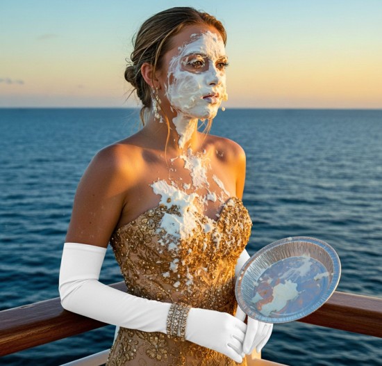 Brook Logan is bound and gagged, and then deluged in gallons of porridge and other mess! She starts out furious but strips naked for some naughty fun...