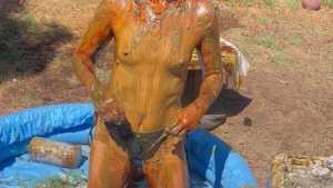 The boys friendly tit4tat continues as each boy pours a bucket of slime over the other guy's head, and feet. Then comes the part they both really enjoy :). Firstly Bernard gives Rafa a handjob, whilst Rafa slimes himself, until he's ready to finish himself off. Rafa cums in a bucket of pink slime and it looks amazing. Then Rafa wanks Bernard, while Bernard slimes himself. Once the time is right, Bernard cums into his own hand... again, it's really hot. Then there's a final setpiece that I love... Rafa lies on the floor with his face inches above a pie, and Bernard slowly lowers his foot onto Rafa's head, pushing Rafa's face right into the pie, for great coverage. At the end the 2 guys wave goodbye after a fantastic messy session.