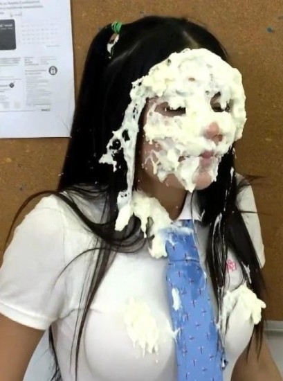 Surprised TheVillainessBF with a big sloppy cream pie to the face